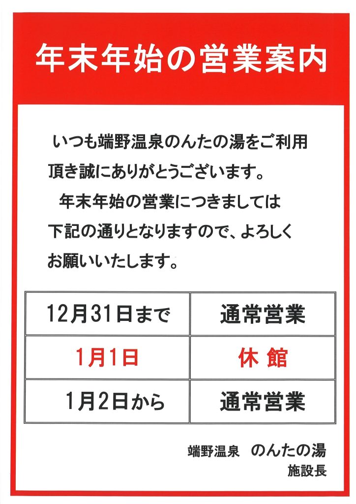 【のんたの湯】年末年始の営業案内
