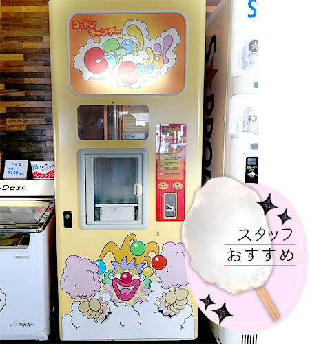 休養村センター入口正面に設置しています。とても古い機械ですが、100円でわたあめを作ってくれる人気者です。