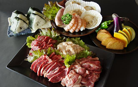 (上牛サガリ/牛カルビ/牛タン/ホルモン/大エビ/活ホタテ/焼野菜/おにぎり1個)